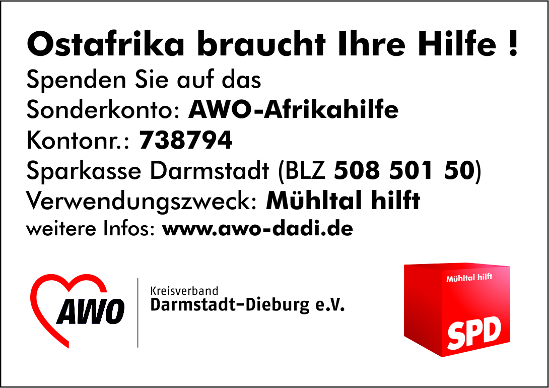 AWO-Afrikahilfe, Spendenkonto 738794, Sparkasse Darmstadt, BLZ 50850150, Stichwort „Mühltal hilft“.