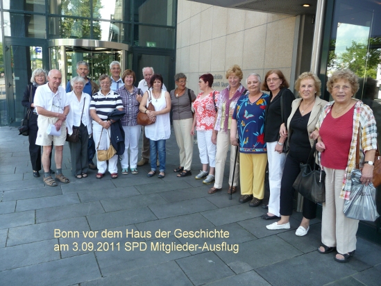 Für den diesjährigen Ausflug der SPD war das Haus der Geschichte in der ehemaligen Bundeshauptstadt Bonn eine gute Wahl. Nach knapp 2 Stunden Fahrzeit im bequemen Reisebus war man am Ziel. Es ist eines der meistbesuchtesten Museen in Deutschland, denn mit seiner Vielfalt an Dokumenten und Objekten zeigt es übersichtlich die Geschichte Deutschlands von 1945 bis heute. Einige der Teilnehmer hatten noch gute Erinnerungen an das Ende des zweiten Weltkrieges, die Bilder von vom Hunger gezeichneten deutschen Kriegsgefangenen, Trümmerfrauen, kistenweise Suchanfragen usw. traurig und nachdenklich stimmten. Beeindruckend und an Hand von vielen Originalobjekten, Bildern, Filmen, Informationstafeln usw. bestens dokumentiert, ist aber auch die Weiterentwicklung Deutschlands in allen Facetten.