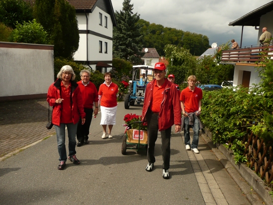 Auch bei dem Waschenbacher Kerbeumzug war die SPD Mühltal gut vertreten und verteilte zur Freude der Zuschauenden rote Rosen und an die Kinder Gummibärchen.