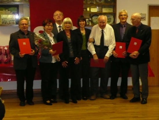 Auch in diesem Jahr konnten am 13. November 2010 im Rahmen eines gemütlichen Mitgliedertreffens 12 Mitglieder für ihre langjährige Parteizugehörigkeit geehrt werden. Auf eine 40 jährige Mitgliedschaft können die Herren Gernot Runtsch, Volker Möller, Volkmar Pupp und der extra aus Berlin angereiste Hans Jochen Martin zurück blicken; eine 25 jährige Mitgliedschaft können Brigitta Busch, Volker Busch, Keles Hüseyin, Thomas-Karl Göbel, Carsten Ritter, Aslan Mehmet vorweisen. Gerhard Giebenhain und Günter Leissler sind seit 10 Jahren Mitglied. Die Mitgliederehrung wurde von der SPD Landtagsabgeordneten Heike Hofmann vorgenommen. Heike Hofmann und die Vorsitzende des SPD Ortsvereins Ruth Breyer würdigten jeweils die langjährigen Mitgliedschaften und die damit zum Ausdruck gebrachte Treue und Verbundenheit. Bei einem kleinen Imbiss konnten anschließend politische Meinungen und Ansichten ausgetauscht werden.